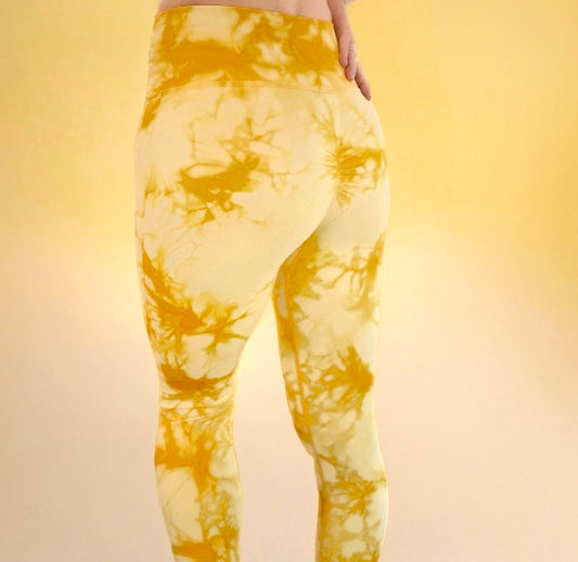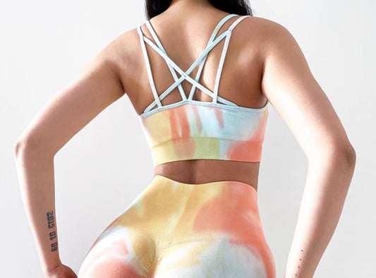 High waist pleated back pants and X-shape bra set, Yellow Tie dye