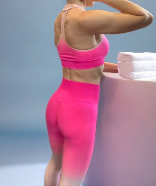 High waist pleated back pants and T-shape bra set, bright pink ombre