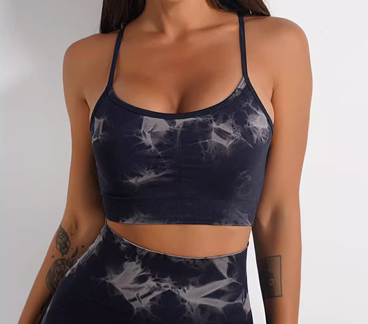 High waist pants and adjustable straps bra set, Tie dye Black & grey